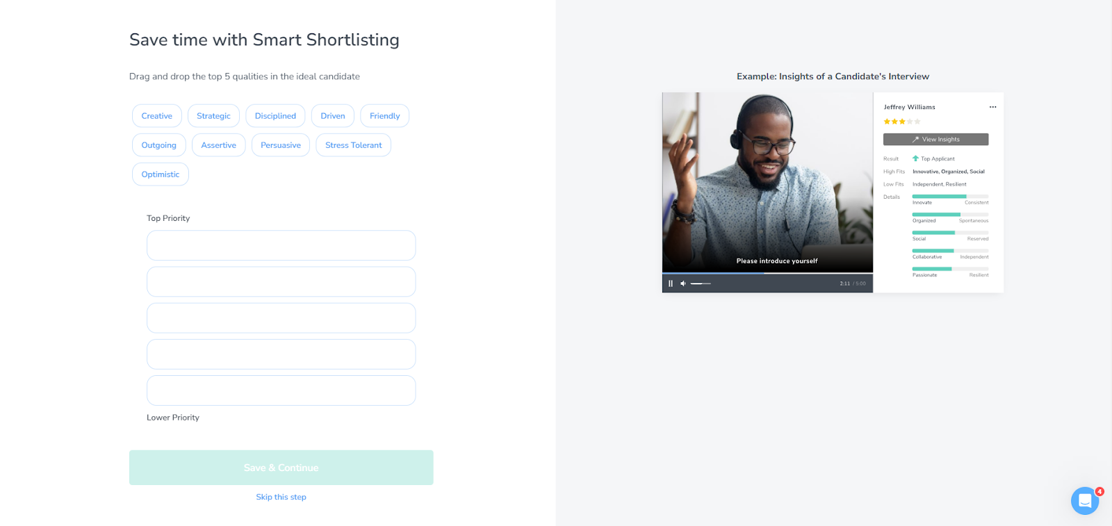 Through our Smart Shortlisting step, you can choose from the designated Keywords that are written down as Qualities for a given candidate, which they ought to possess in order to be a good fit for the role they’re applying for. The Qualities are preset and separated into 2 categories that you can Drag & Drop to: Top Priority, and Lower Priority, and let our AI do its magic by analyzing the content for personality behavior markers or tags from what the candidates have said and inform you whether they are an appropriate fit for the job!