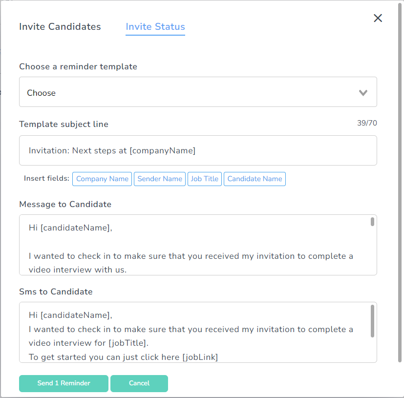 After clicking the "Send Reminder" button, you will be directed to a screen where you can custom edit the message candidates receive as an email reminder or an SMS reminder (if you’ve inputted a phone number when you were inviting the candidate).