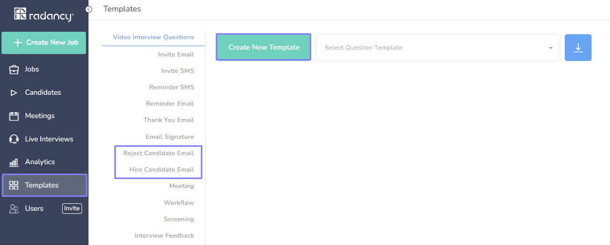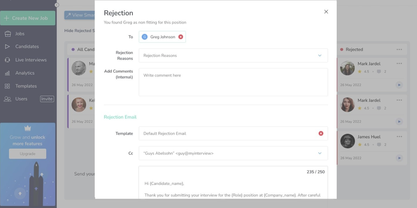 Streamline the email sending process in your templates tab by customizing 'hired' and 'rejected' email templates, available on our team plan and above.