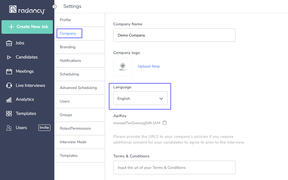 When you go to Settings in your Screening & Scheduling account and select the Company tab, you can choose the language for your interviews.