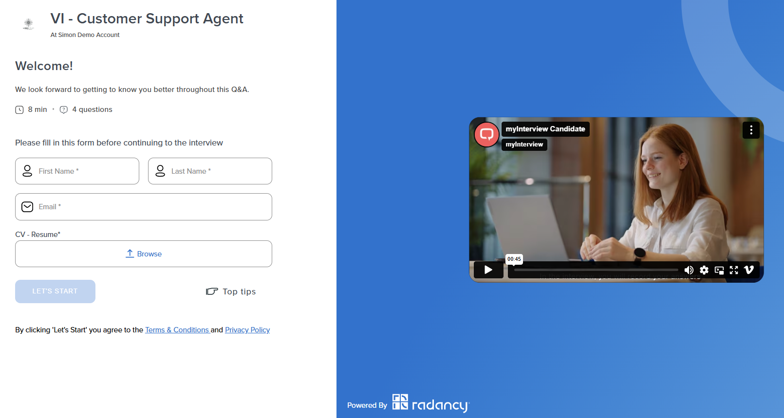Candidates are prompted to enter their first name, last name, and email address. If you have enabled document uploads, they will also be able to submit their CV or other relevant documents prior to starting the interview.