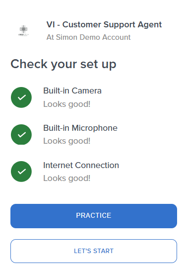 After entering their information and uploading documents, candidates click Start Interview. A pop-up page allows them to: