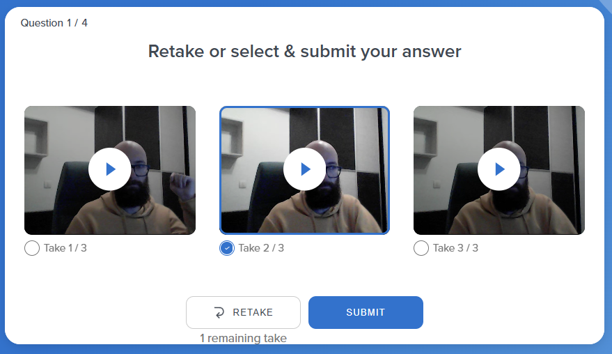 If retakes are enabled, candidates can review their recorded responses and see how many attempts they have remaining. They can watch their recordings, make adjustments if needed, and select the version they wish to submit.